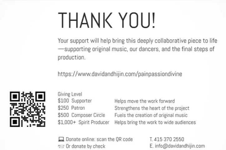 If you would like to donate via Zelle, please send your donation to 415 370 2550. Please include “Pain, Passion, and the Divine” in the memo line so we can acknowledge your contribution.